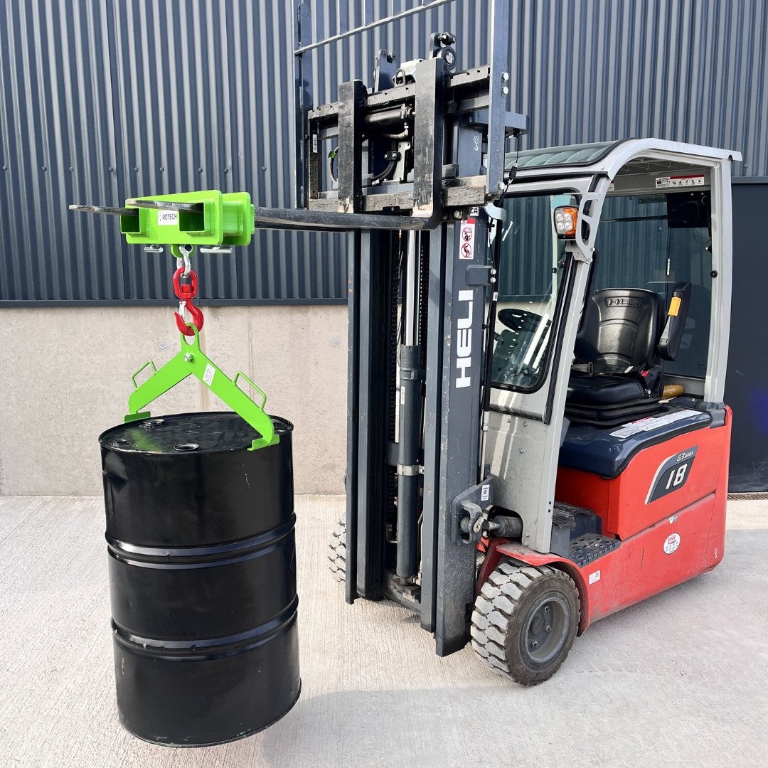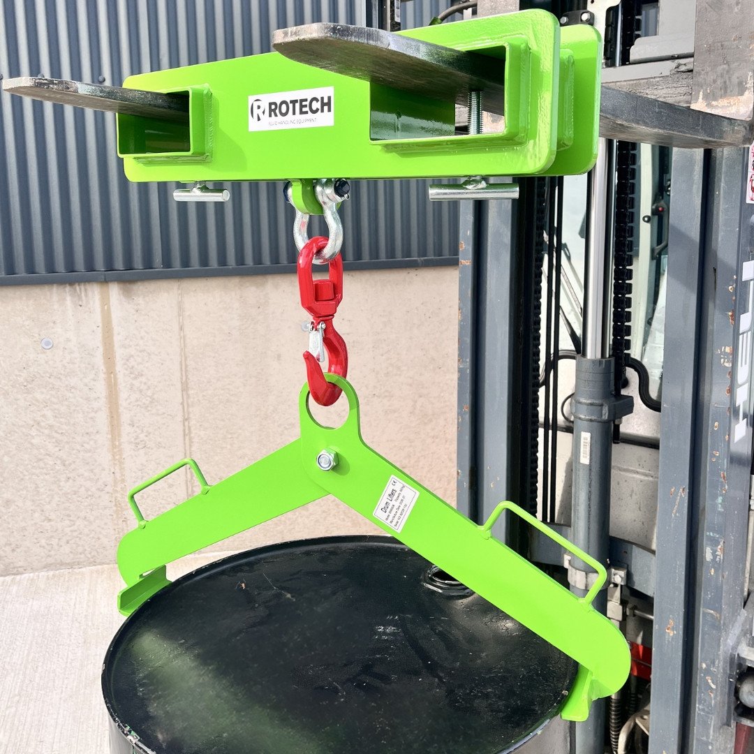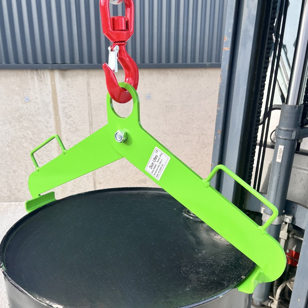 The drum lifting bracket is a simple and effective attachment that can be used with any hoist, forklift, chain lift or other lifting machine. Once positioned over the drum & it is raised; the arms begin to fold inwards, latching onto the rim found on most drums. The clamp then self locks onto the drum using it’s own weight, allowing it to lift effortlessly. Once the drum is returned to the ground & the clamp is lowered it releases its grip allowing the operator to move away without the need to un-attach manually
